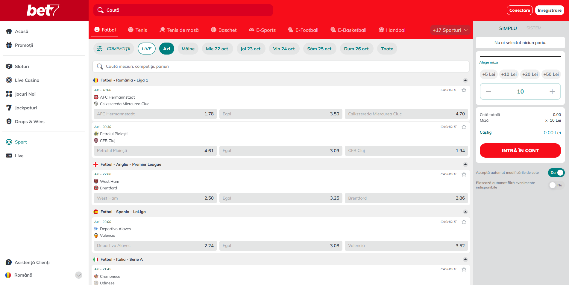 - Se poate miza pe orice sport, competiție și opțiune de pariu.