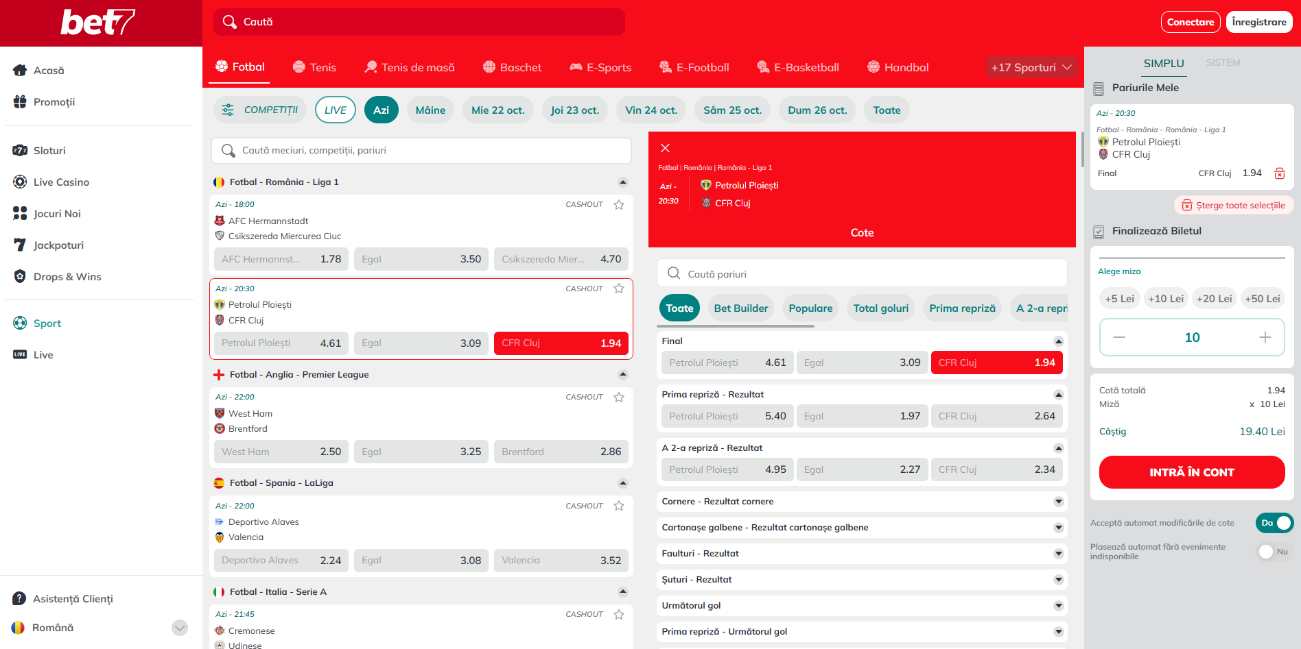 - Bet Builder – Permite plasarea mai multor pariuri din același meci pe un singur bilet;