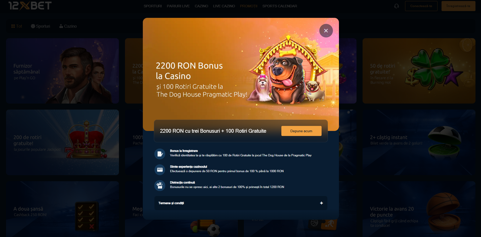 Bonusul de bun venit la 12xBet Casino este format din trei bonusuri la depunere. Dacă reușești sa rulezi toate cele trei bonusuri, vei ajunge la un total de 2200 RON, ceea ce nu este deloc de neglijat.
