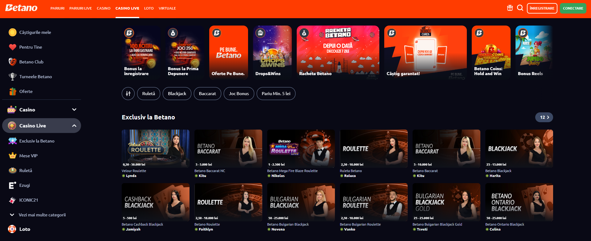 Ești adeptul jocurilor în timp real? Atunci Betano este platforma unde ai acces la asemenea jocuri de cazino. Atmosfera de cazino vine la tine acasă prin intermediul jocurilor Live disponibile, chiar si cu dealeri romani. Diferite tipuri de ruletă, poker, baccarat sau blackjack te vor încânta. Acestea aparțin de furnizorii de jocuri live Evolution Live Games, Playtech Live Games, Skywind, Pragmatic Play si Ezugi. Sunt si 12 mese exclusive Betano, cu ruleta si blackjack.