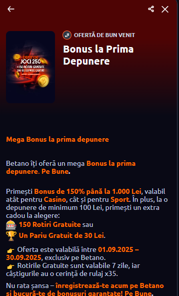Betano Casino oferă un bonus de bun venit de 150% până la 1000 RON + 150 Rotiri Gratuite. Promoția este disponibilă doar jucătorilor noi. Se activează imediat după depunere și este necesar mai întâi să rulezi suma depusă cel puțin o dată la jocurile din Cazinou.