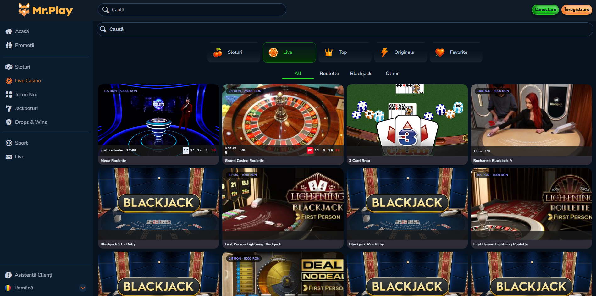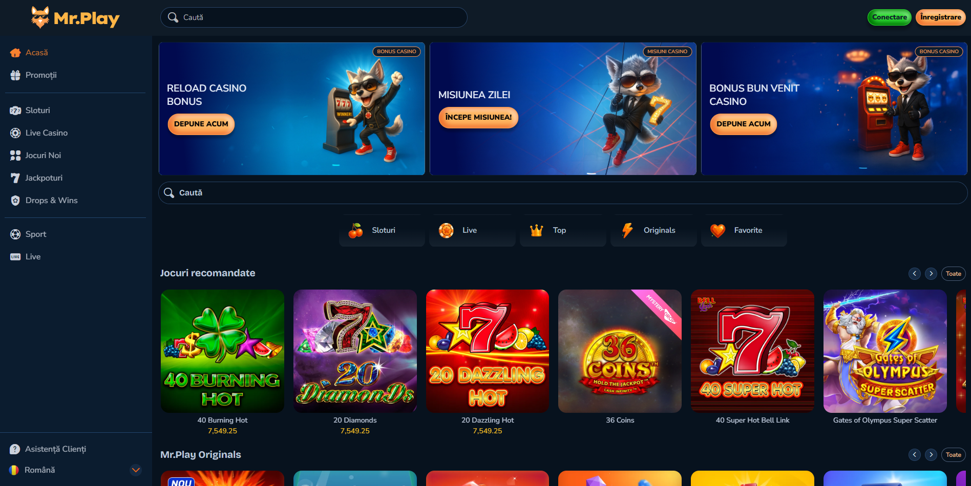 Atunci când intrăm pe MrPlay avem o plăcuta surpriză: căutarea jocurilor preferate se face foarte ușor. Operatorul a împărțit jocurile pe subcategorii: Sloturi, Live, Top, Originale și Favorite. Apăsând unul din aceste butoane ajungi mult mai repede la Slotul favorit.