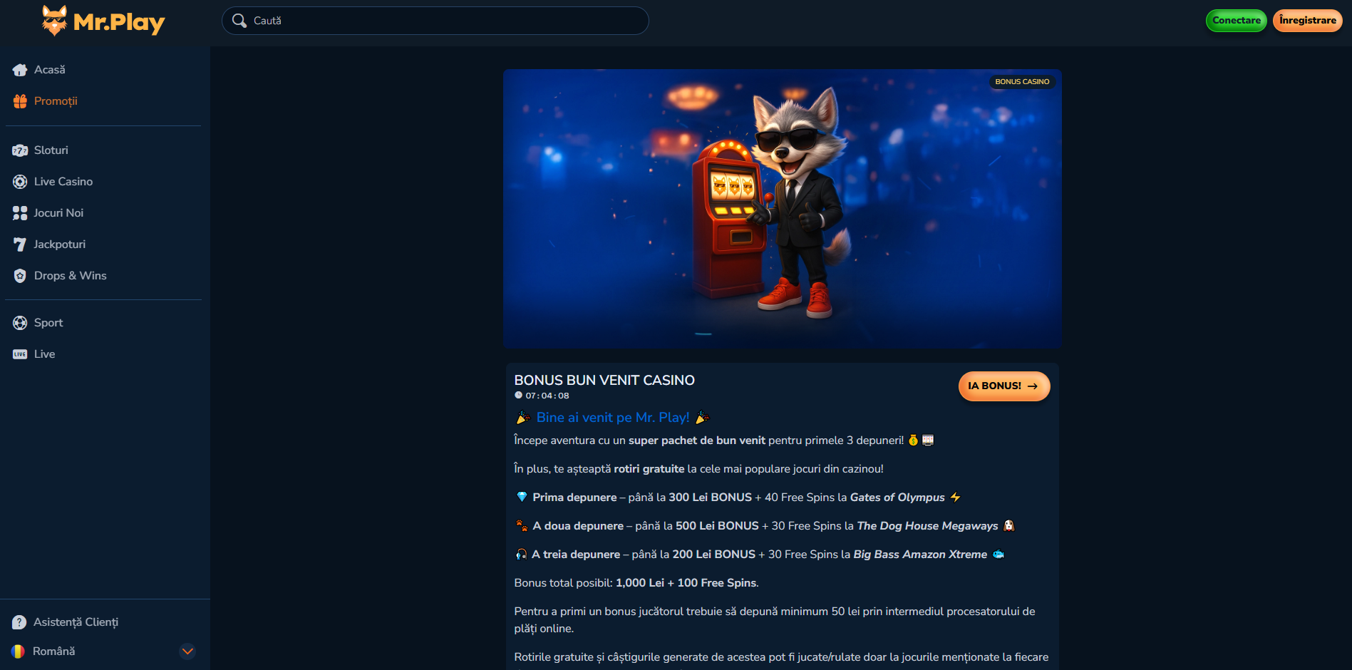 Poți să îți începi aventura la MrPlay cu un bonus de bun venit care este valabil pentru primele trei depuneri. Acesta constă înre-un bonus total posibil de 1.000 de lei la care se adaugă 100 Free Spins. Pentru a fi eligibil pentru acest bonus, jucătorul trebuie să depună minim 50 Lei.