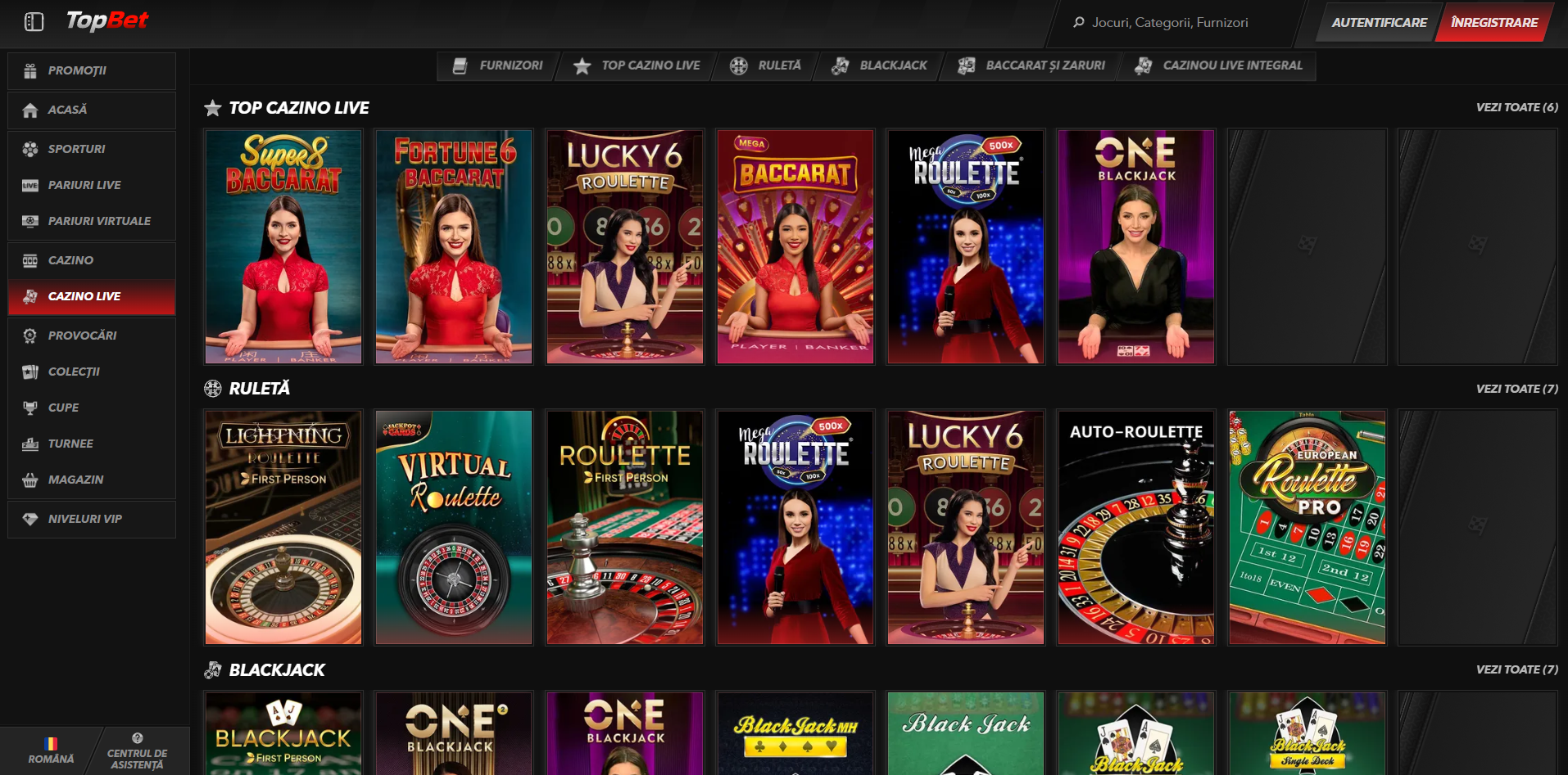 TopBet îți aduce atmosfera autentică a cazinoului direct pe ecranul tău prin secțiunea de live casino. Sunt șapte mese de ruletă, inclusiv Virtual Roulette, cu mize plecând de la 0.10 RON. Puține opțiuni ce-i drept, unele cu dealer real. Lucrurile nu stau excepțional nici la blackjack (șapte opțiuni) și nici la baccarat (patru mese). Acordăm însă credit celor de la TopBet, care abia au lansat site-ul. Va mai dura ceva pana cand vom avea pachetul “complet” la live casino.