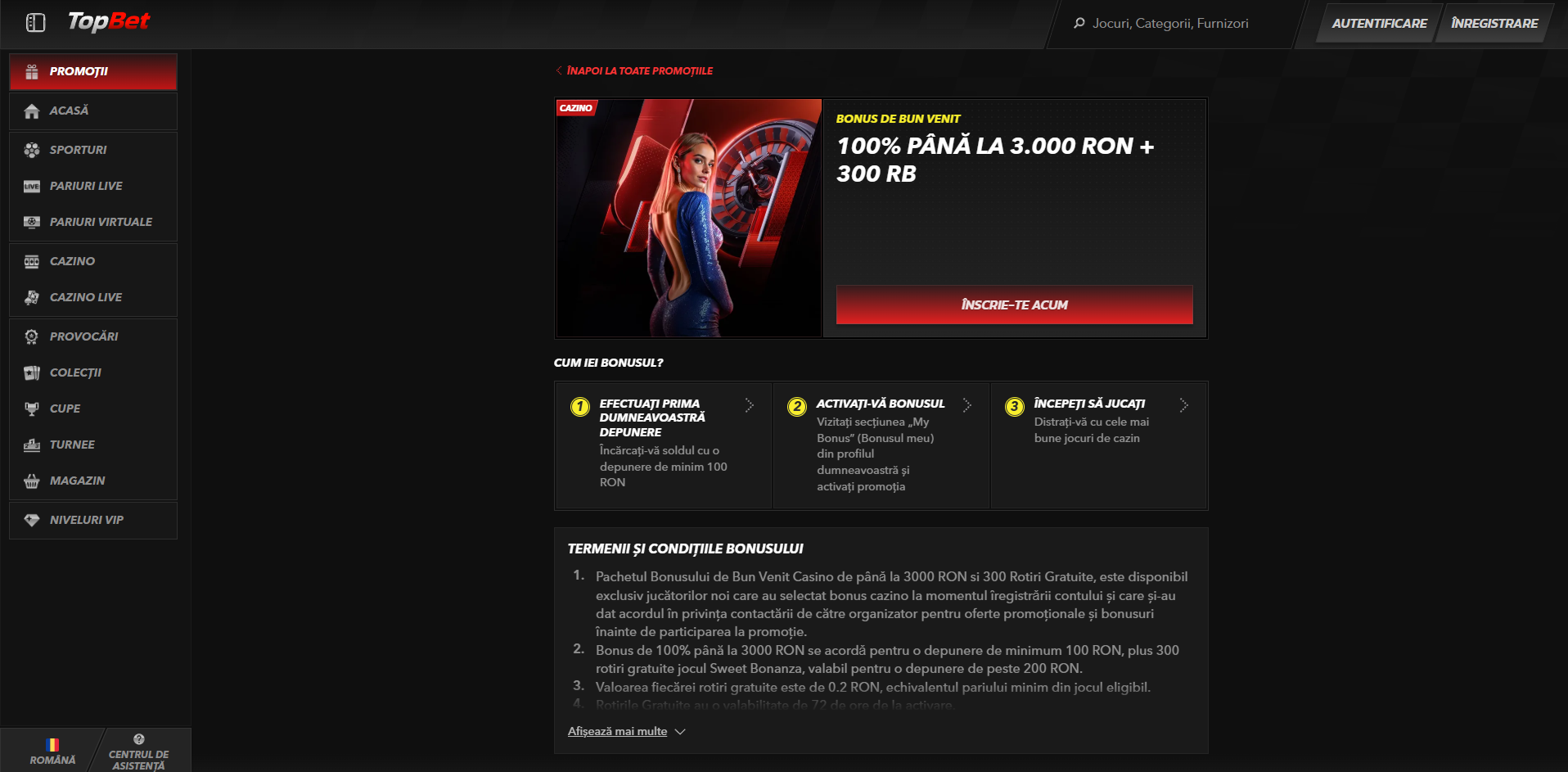 Pachetul de start la TopBet Casino consta în 100% până la 3.000 RON, la care se mai adaugă 300 de rotiri gratuite dacă valoarea primului depozit este de minimum 200 RON.