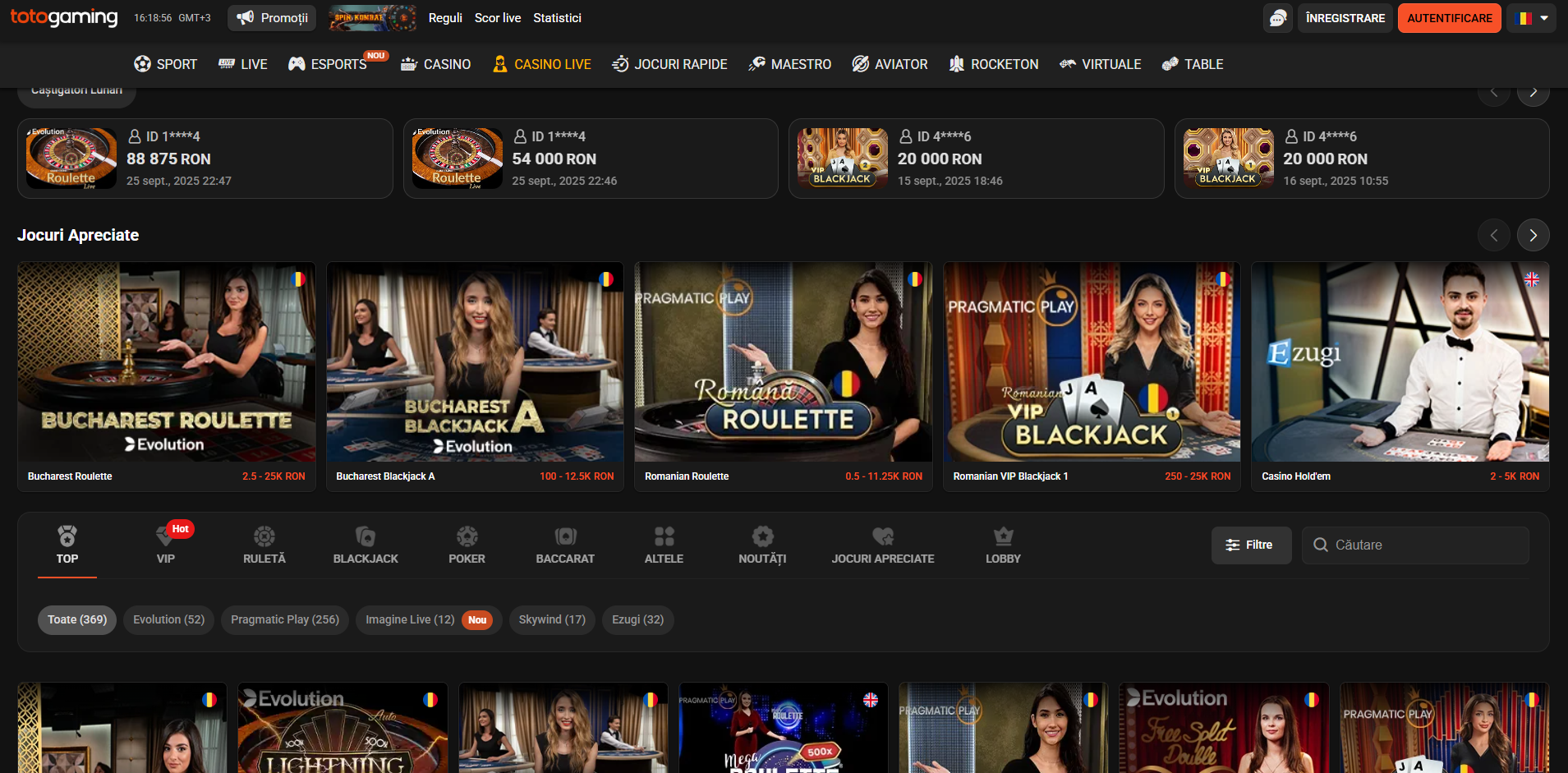 Jocurile cu dealer live se găsesc în număr foarte mare pe platforma TotoGaming, acolo unde putem avea acces la 299 de mese cu ruletă, blackjack, baccarat și altele. Cele mai multe mese aparțin furnizorului Pragmatic Play, dar Evolution, Skywind Group și Ezugi ne propun câteva zeci de mese la fel de atrăgătoare.