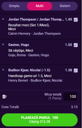 Tipster-ul Legalbet vă recomandă un combo la o cotă totală de 3.13 format din trei evenimente din tenis; multă baftă şi pariaţi responsabil!