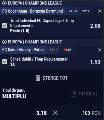 Expertul Legalbet vă recomandă pe biletul zilei două meciuri din Champions League. Biletul are o cotă totală mai mare de 3.00.