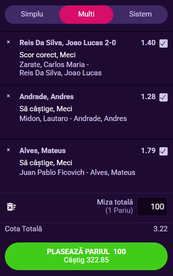 Ziua de astăzi ne rezervă câteva partide foarte interesante din tenis, din cadrul turneelor ATP Challenger Tour de la Temuco (Chile, hard outdoor) şi Bogotá (Columbia, zgură). Am consultat lista caselor de pariuri online licenţiate în România şi am ales să plasez acest bilet la partenerii de la Player.ro!