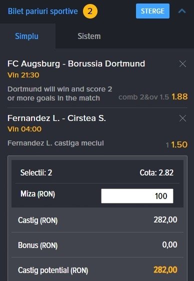 - · Predicţie: Dortmund câştigă şi înscrie cel puţin două goluri (cotă