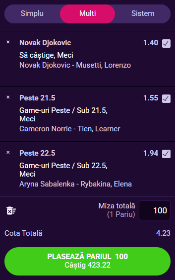 Tipster-ul Legalbet vă recomandă un combo la o cotă totală de 4.23 format din trei evenimente din tenis; multă baftă şi pariaţi responsabil!