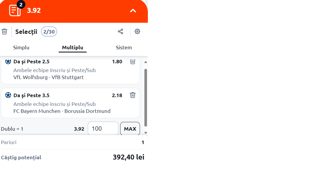 Expertul Legalbet, vă recomandă un bilet în cotă 3.92 de sâmbătă, care vine din meciurile Wolfsburg - Stuttgart și Bayern Munchen - Borussia Dortmund.