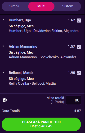 Tipster-ul Legalbet vă recomandă un combo la o cotă totală de 4.87 format din trei evenimente din tenis; multă baftă şi pariaţi responsabil!