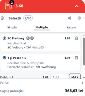 Expertul Legalbet vă recomandă un bilet în cotă 3.68 de duminică, format din meciurile Eintracht Frankfurt - Wolfsburg și Freiburg - Mainz.
