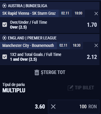 Expertul Legalbet, vă recomandă un bilet de cota 3.60 , care include meciurile SK Rapid - Sturm Graz şi Manchester City - Bournemouth.