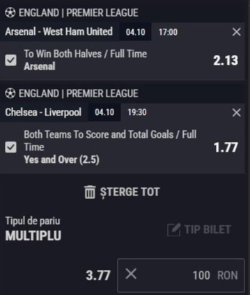 Expertul Legalbet, vă recomandă un bilet de cota 3.77 , care include meciurile Arsenal - West Ham şi Chelsea - Liverpool.