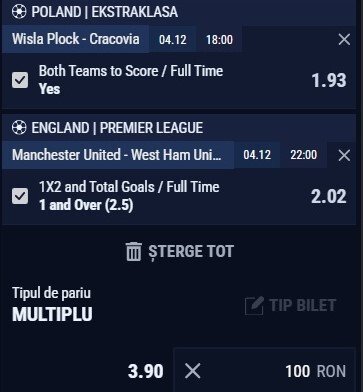 Expertul Legalbet, vă recomandă un bilet de cota 3.90 , care include meciurile Plock – Cracovia şi Manchester United - West Ham.