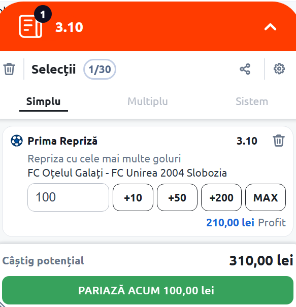 ► Oțelul Galați - Unirea Slobozia: repriza cu cele mai multe goluri - prima, cota 3.10
