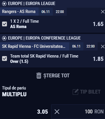 Expertul Legalbet vă recomandă pe biletul zilei meciuri din Europa League, respectiv Conference League. Cota totală a biletului este aproximativ 3.00.