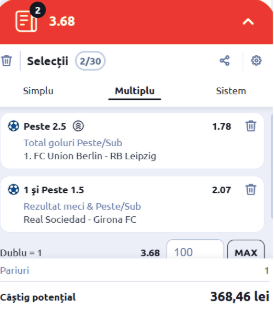 Expertul Legalbet vă recomandă un bilet în cotă 3.68 de duminică, format din meciurile Union Berlin - RB Leipzig și Real Sociedad - Girona.