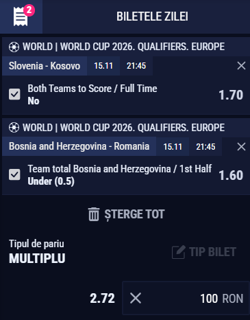 Expertul Legalbet vă recomandă pe biletul zilei două meciuri din preliminariile Campionatului Mondial, în care ambele echipe luptă pentru calificare. Cota biletului este mai mare de 2.50.