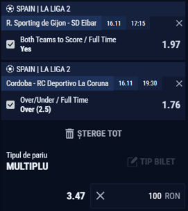 Expertul Legalbet vă recomandă un bilet de cota 3.47 , care include meciurile Gijon – Eibar şi Cordoba - La Coruna.