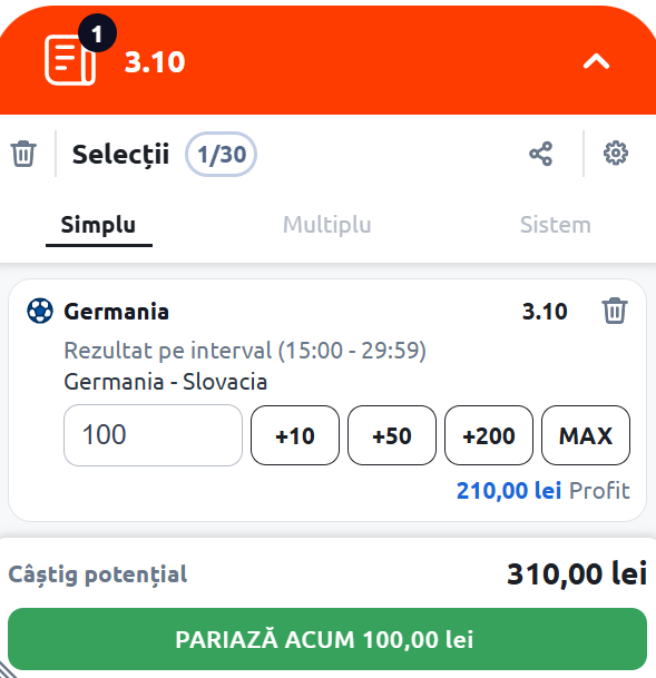 ► Germania - Slovacia : Rezultat pe interval 15:00 - 29:59: 1, cota