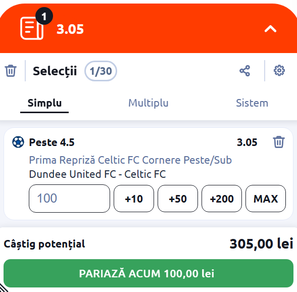 ► FC Dundee United - Celtic Glasgow: peste 4,5 cornere Celtic în repriza întâi, cota 3.05