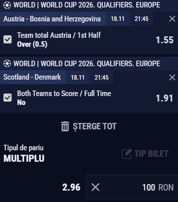 Expertul Legalbet vă recomandă pe biletul zilei meciuri din ultima etapă a preliminariilor Campionatului Mondial. În ambele partide se va decide echipa care va merge direct la turneul mondial de anul viitor. Dacă acest bilet va fi câștigător, ne vom tripla miza.