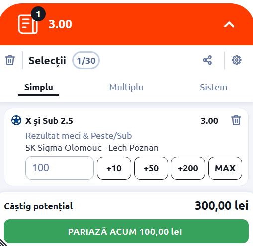 ► Sigma Olomouc - Lech Poznań: X & sub 2,5 goluri, cota 3.00