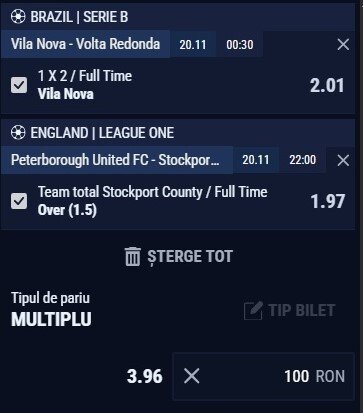 Expertul Legalbet vă recomandă un bilet de cota 3.96 , care include meciurile Vila Nova - Volta Redonda şi Peterborough - Stockport.