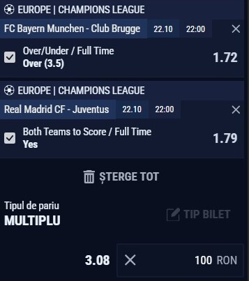 Expertul Legalbet, vă recomandă un bilet de cota 3.08 , care include meciurile Bayern - Club Brugge şi Real Madrid - Juventus.
