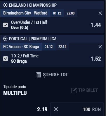 Expertul Legalbet, vă recomandă Cota 2 de luni, 1 decembrie, aceasta fiind alcătuită din meciurile Birmingham - Watford şi Arouca - Braga. Puteţi paria pe aceste partide la casele de pariuri online licenţiate din România.