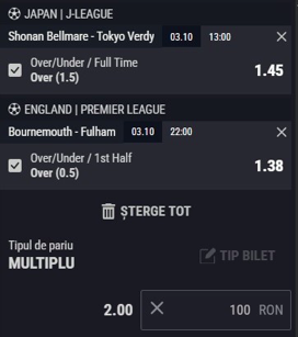 Expertul Legalbet vă recomandă Cota 2 de vineri, 3 octombrie, aceasta fiind alcătuită din meciurile Shonan – Verdy şi Bournemouth - Fulham.