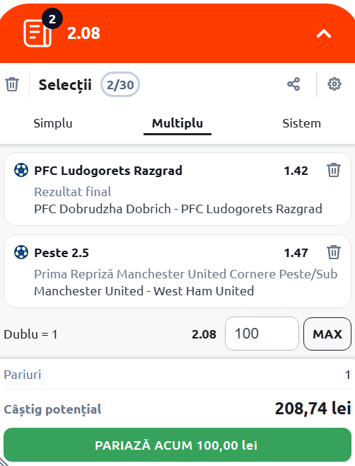Expertul Legalbet vă recomandă Cota 2 de joi, 4 decembrie 2025, care vine cu meciurile FC Dobrudzha Dobrich - Ludogorets Razgrad şi Manchester United - West Ham United.