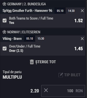 Expertul Legalbet, vă recomandă Cota 2 de duminică, 5 octombrie, aceasta fiind alcătuită dinmeciurile Furth - Hannover şi Viking - Brann. Puteţi paria pe aceste partide la casele de pariuri online licenţiate din România.