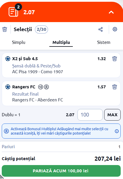 ► Rangers - Aberdeen: 1 solist, cota 1.57► Cota 2 finală: 2.07