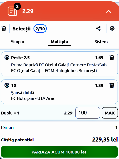 ► FC Botoșani - FC UTA Arad: 1X, cota 1.39► Cota 2 finală: 2.29