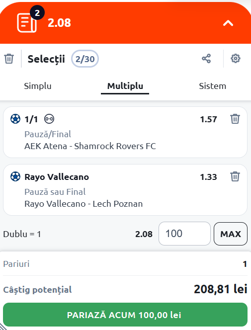 Expertul Legalbet, vă recomandă Cota 2 de joi, 6 noiembrie 2025, care vine cu meciurile AEK Atena - Shamrock Rovers şi Rayo Vallecano - Lech Poznań.