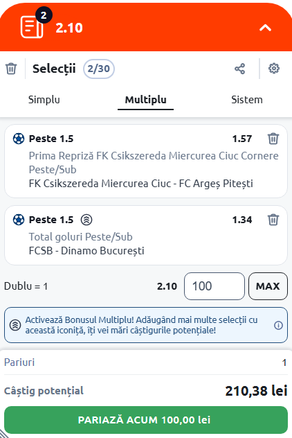 ► FK Csíkszereda - FC Argeș Pitești: peste 1,5 cornere în prima repriză FK Csíkszereda, cota