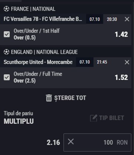 Expertul Legalbet vă recomandă Cota 2 de marţi, 7 octombrie, aceasta fiind alcătuită din meciurile Versailles – Villefranche şi Scunthorpe - Morecambe.