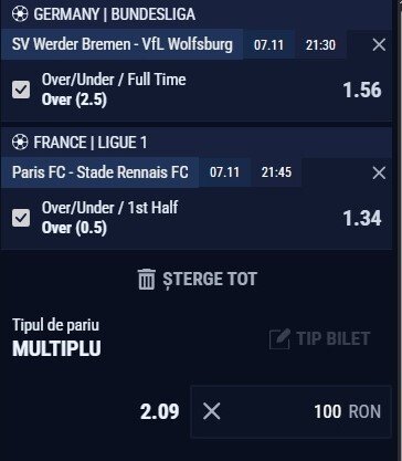Expertul Legalbet, vă recomandă Cota 2 de vineri, 7 noiembrie, aceasta fiind alcătuită din meciurile Bremen – Wolfsburg şi Paris FC - Rennes. Puteţi paria pe aceste partide la casele de pariuri online licenţiate din România.