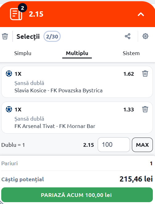 Expertul Legalbet vă recomandă Cota 2 de miercuri, 8 octombrie 2025, care vine cu meciurile Slávia TU Košice - MŠK Považská Bystrica şi FK Arsenal Tivat - FK Mornar Bar.