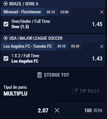 Expertul Legalbet, vă recomandă Cota 2 de joi, 9 octombrie, aceasta fiind alcătuită din meciurile Mirassol – Fluminense şi Los Angeles FC - Toronto FC. Puteţi paria pe aceste partide la casele de pariuri online licenţiate din România.