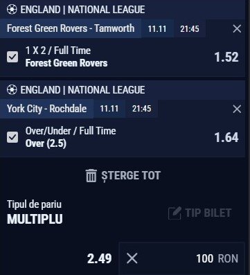 Expertul Legalbet, vă recomandă Cota 2 de marţi, 11 noiembrie, aceasta fiind alcătuită din meciurile Forest Green - Tamworth şi York - Rochdale. Puteţi paria pe aceste partide la casele de pariuri online licenţiate din România.