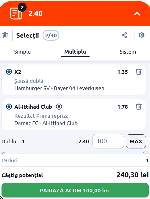 ► Damac FC - Al-Ittihad Club: 2 la pauză, cota 1.78► Cota 2 finală: 2.40