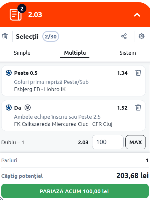 Expertul Legalbet vă recomandă Cota 2 de joi, 16 octombrie 2025, care vine cu meciurile Esbjerg fB - Hobro IK şi FK Csíkszereda - CFR Cluj.