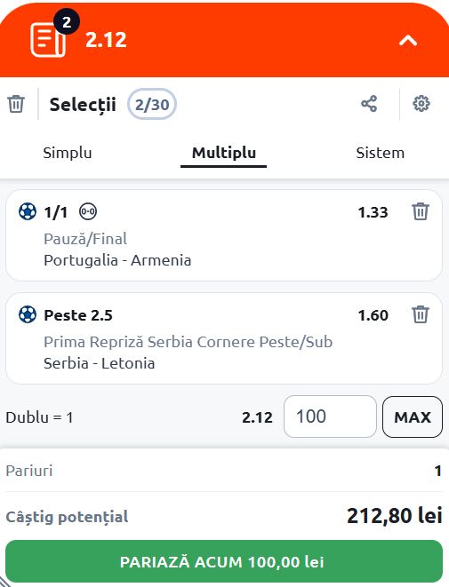 Expertul Legalbet vă recomandă Cota 2 de duminică, 16 noiembrie 2025, care vine cu meciurile Portugalia - Armenia şi Serbia - Letonia.