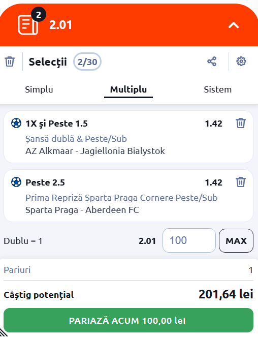 Expertul Legalbet vă recomandă Cota 2 de joi, 18 decembrie 2025, care vine cu meciurile AZ Alkmaar - Jagiellonia Białystok şi Sparta Praga - FC Aberdeen.