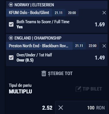 Expertul Legalbet vă recomandă Cota 2 de vineri, 21 noiembrie, aceasta fiind alcătuită din meciurile KFUM Oslo - Bodo/Glimt şi Preston - Blackburn. Puteţi paria pe aceste partide la casele de pariuri online licenţiate din România.